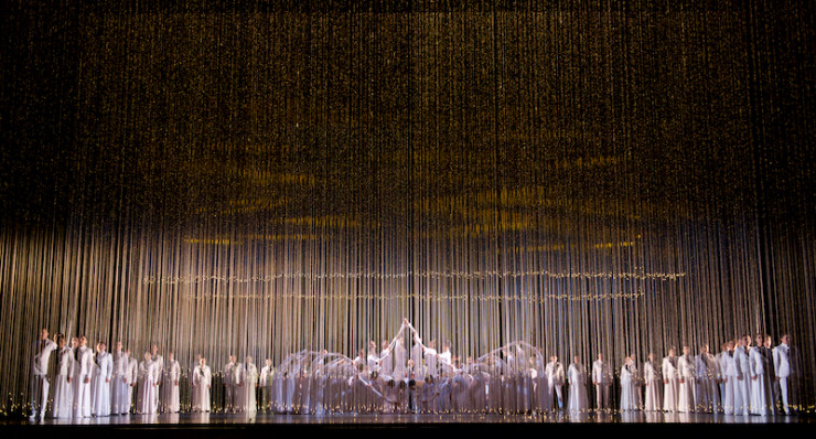 Завершающая сцена Рая полностью выдержана в белом цвете, она говорит нам о неподвластном влиянии времени. В музыкальную основу материала легла знаменитая Симфония № 9 Бетховена. Посыл этого произведения ясный и современный. Именно сегодня, когда в мире множество конфликтов, он особенно актуален, это произведение об объединении людей.