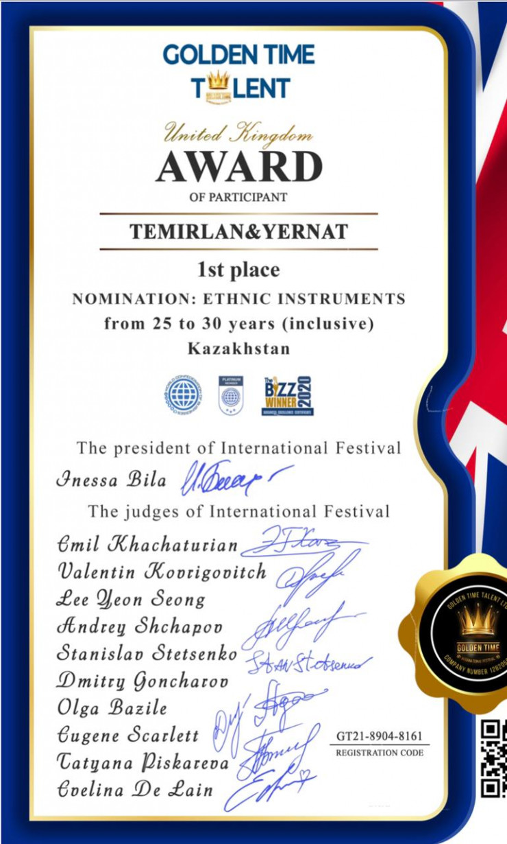 Домбристы Темирлан Олжабай и Ернат Наурыз завоевали первое место на международном фестивале Golden Time Talent, передает корреспондент Tengrinews.kz.