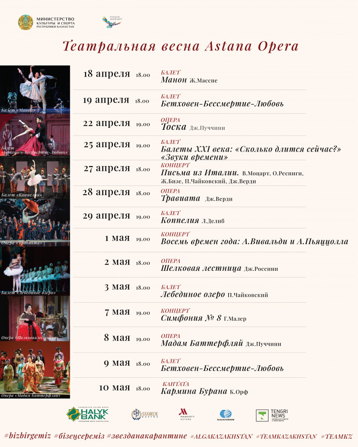 В период с 18 апреля по 10 мая впервые онлайн на TengriTV можно увидеть балеты "Манон" в хореографии Кеннета Макмиллана, "Сколько длится сейчас?", "Бетховен - Бессмертие - Любовь", посвященный 250-летию композитора, в хореографии Раймондо Ребека, балет "Коппелия" в хореографии Ролана Пети и многое другое.