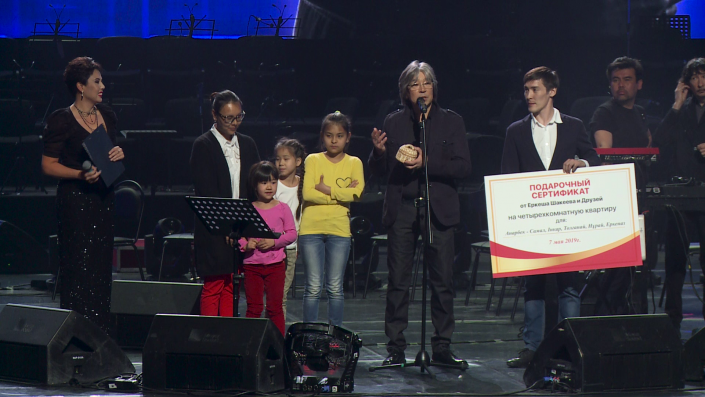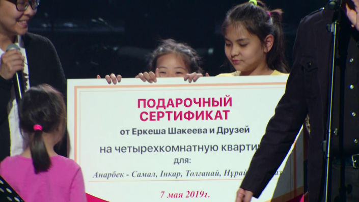 Айнур Махымова, воспитывающая пять девочек, десять лет снимала комнату во времянке. Муж является безработным, а сама Айнур трудится на общественных работах. Старшие дочери учатся в школе, младшая ходит в детский сад. Семья не знала, что на концерте им подарят квартиру.
