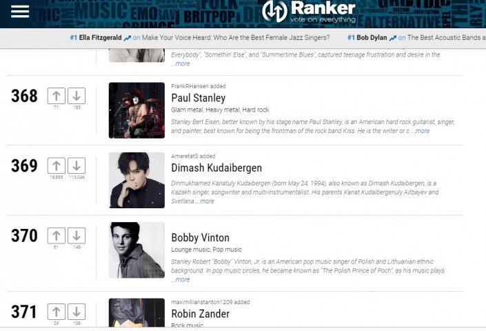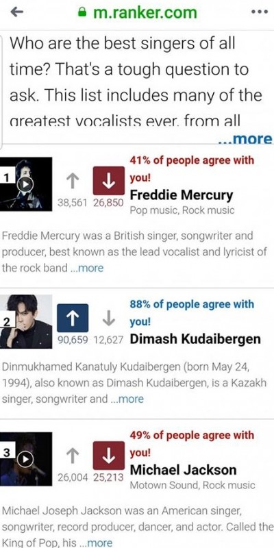 Рейтинг проводился на сайте для опросов Ranker.com. По данным из Википедии, Ranker ежемесячно посещают более 49 миллионов человек. Буквально за несколько часов до закрытия голосования казахстанец располагался на втором месте списка, уступая лишь Фредди Меркьюри. На тот момент за Кудайбергена свои голоса отдали порядка 90 тысяч пользователей.