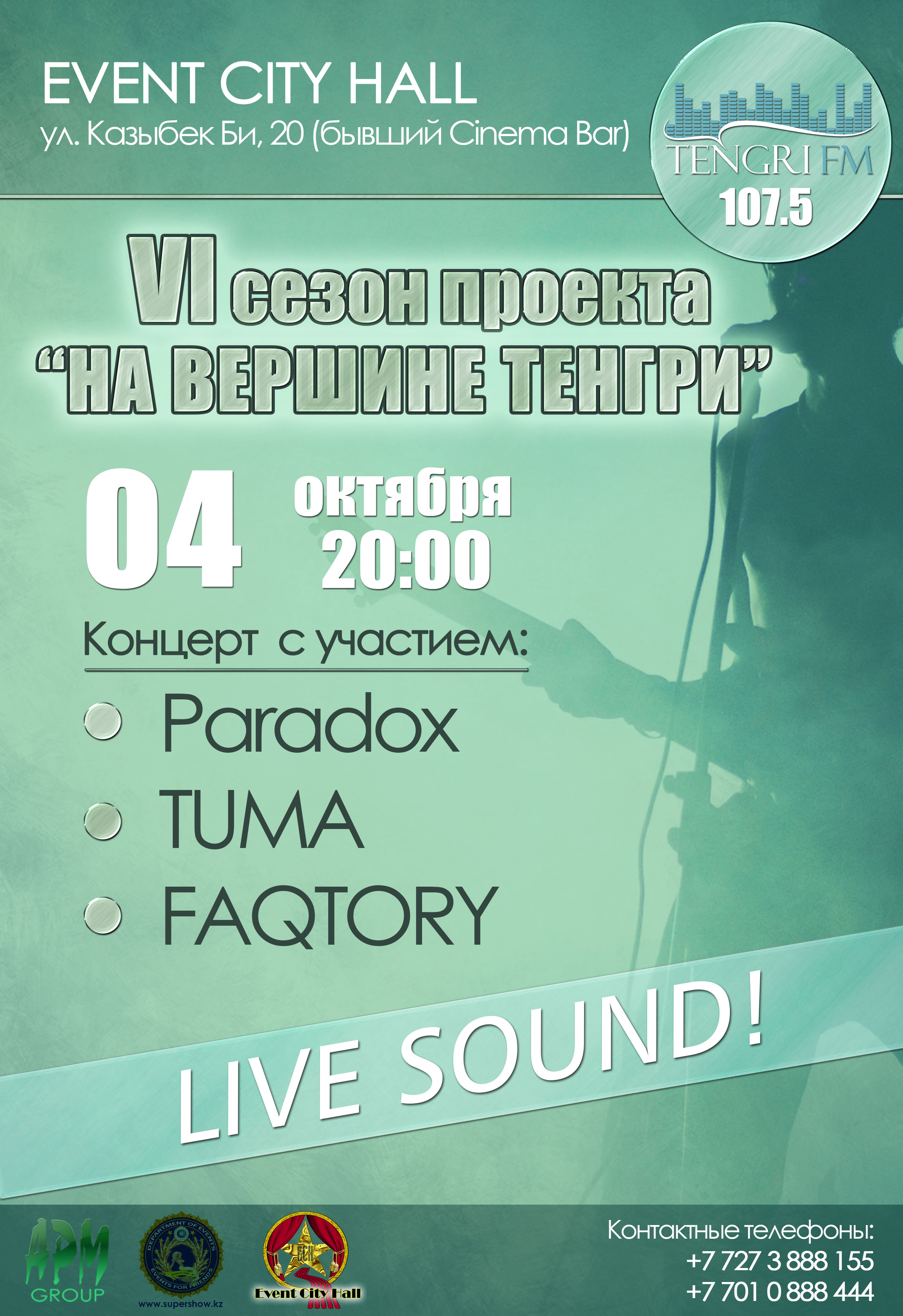 Между тем уже в ближайшую субботу, 4 октября, на сцену выйдут группы Paradox, Faqtory и "Тұма". Концерт начнется в 20.00. "Проект, созданный радио Tengri FM, поистине является уникальным и очень важным для нашей республики. От мероприятия ожидаем "живой" музыки, интеллектуально настроенной публики и хорошего настроения. В нынешнее время "пластМассовой" музыки" проект "На вершине Tengri" - это спасательный круг для музыкантов, играющих по-настоящему", - поделился участник группы Paradox Юрий Леонов.