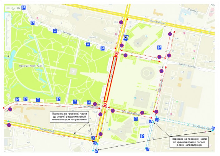 Также, стоянка транспорта вдоль проезжих частей прилегающих к площади улиц будет исключена и организована на парковках Дворца мира и согласия, мечети "Хазрет Султан" и Национального музея. Временная парковка автомашин вдоль дорог будет осуществляться на отдаленных от площади участках.