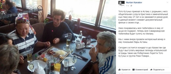 "Тото Кутуньо приехал с семьей, импресарио, музыкантами, целой группой. Мы очень хорошо знакомы с Робертино Лоретти. Приехали с Тараза, чтобы их встретить и посетить концерт. Когда мы прибыли на встречу с Робертино Лоретти, мы познакомились с остальными музыкантами. Потом у нас состоялась встреча, разговоры о творчестве", - рассказал Нурлан Канатов.