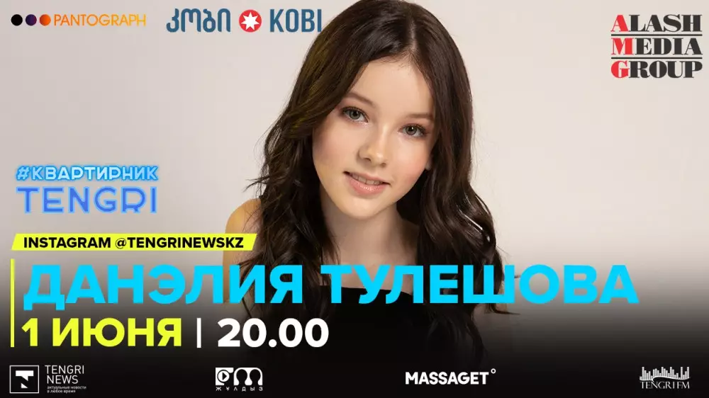 Медиахолдинг Alash Media Group совместно с продюсерским центром Pantograph продолжает серию онлайн-концертов #КвартирникTengri. Партнер проекта - минеральная вода KOBI. Сегодня, 1 июня, в 20.00 состоится Insta-Live с юной казахстанской исполнительницей Данэлией Тулешовой.