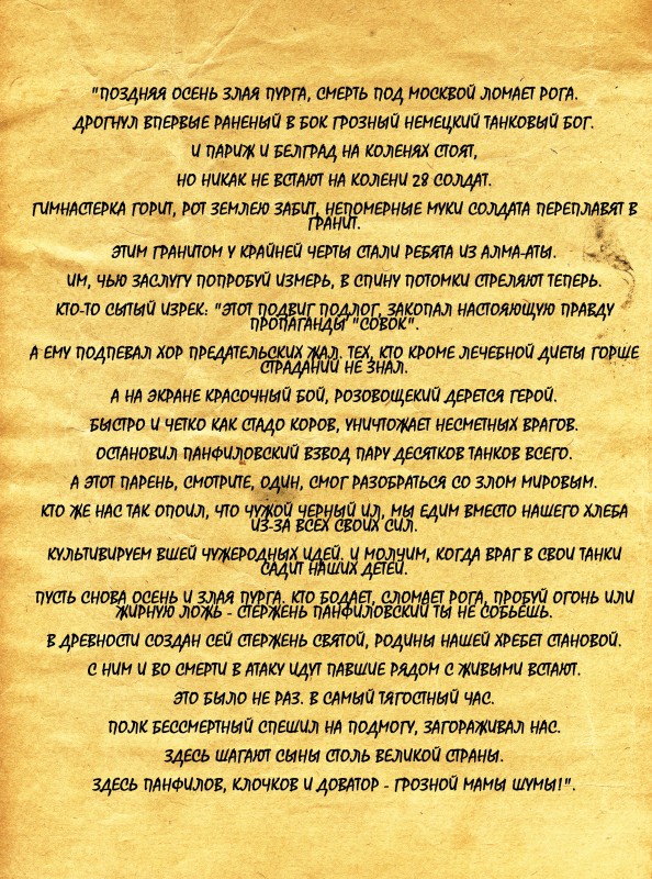 Как отметил режиссер Константин Харалампидис, документальная картина была снята съемочной группой по зову сердца. "Это картина о подлинных, настоящих, невымышленных героях-панфиловцах, которые защитили наш мир от чумы фашизма. Лично я воспринимал этих людей, как своих родных. Каждый мальчишка мечтал быть героем. Это очень важно - сформировать в детях четкое понимание, к чему стремится, к чему идти. Героический пример заставляет бороться со своей собственной трусостью, стараться побороть в себе негативные вещи, чтобы быть похожим на героя", - поделился он.