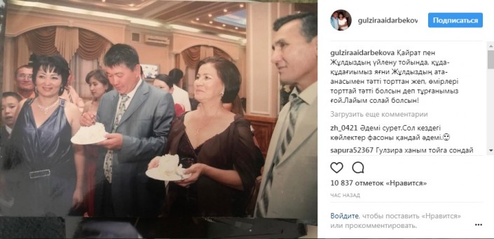 Также мама Кайрата Нуртаса выложила фото вместе с родителями невестки Жулдыз. "Мы на свадьбе Кайрата и Жулдыз с родителями и моими сватьями, кушая вкусный торт, желаем, чтобы их жизнь была такой же сладкой, как этот торт! Пусть всегда так будет!" - написала мама певца.