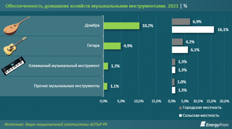 В городской местности у 6,9 процента домохозяйств имелась домбра, у 4,2 процента - гитара, у 1,3 процента - клавишный инструмент. В сельской местности 16,1 процента были обеспечены домбрами, 6,1 процента - гитарами, 1,3 процента - клавишными инструментами.