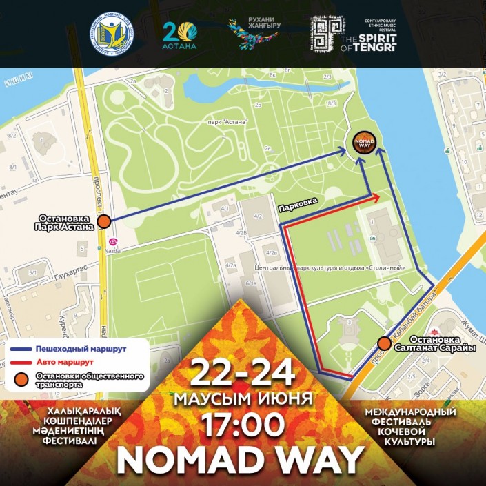 Местом проведения Nomad Way 2018 выбран амфитеатр на набережной реки Есиль. Добраться до него можно на маршрутах № 18, 28, 32, 37, 44, 52 и 127 (остановка "Салтанат Сарайы", проспект Кабанбай батыра), а также на маршрутах № 12, 17, 21, 36, 46, 50, 53, 54 и 107 экспресс (остановка Парк "Астана", проспект Туран).