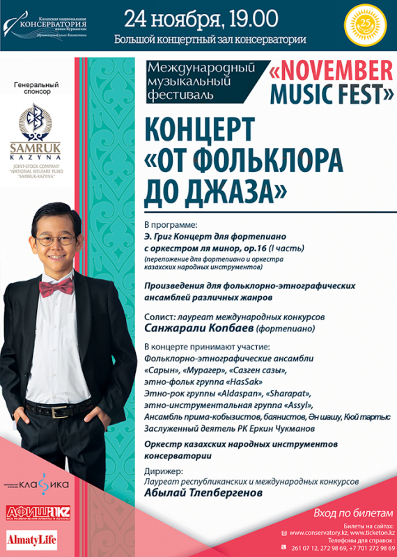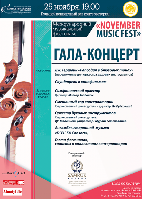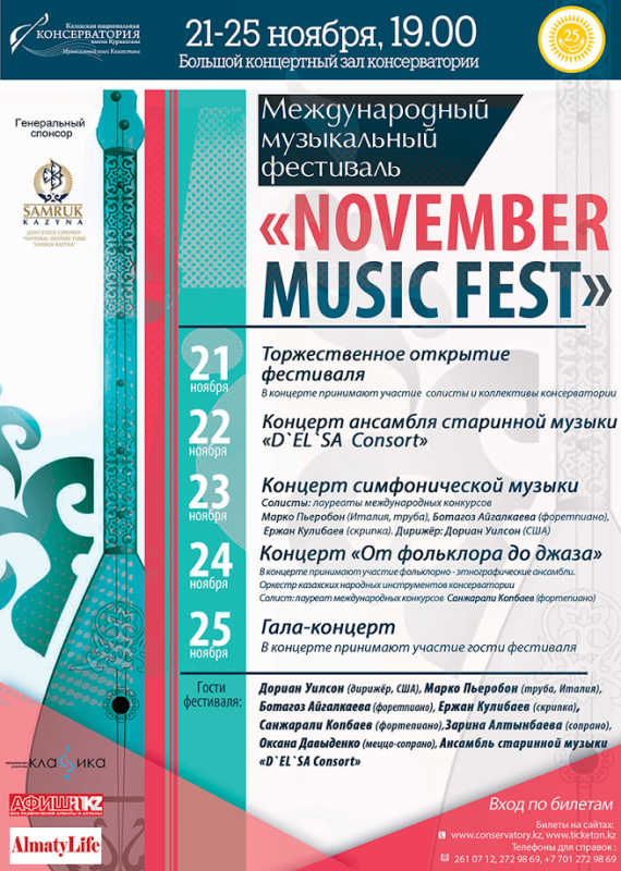 21-25 ноября в Казахской национальной консерватории имени Курмангазы пройдет Международный музыкальный фестиваль November Music Fest, посвященный 25-летию Независимости РК, передает корреспондент Tengrinews.kz.