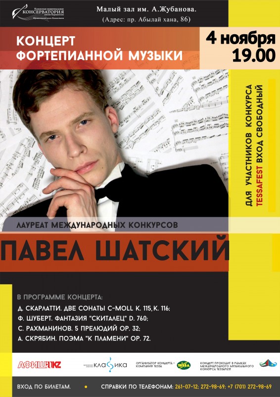 В Малом зале имени Жубанова Казахской национальной консерватории имени Курмангазы 4 ноября в 19.00 состоится концерт лауреата международных конкурсов пианиста Павла Шатского, передает корреспондент Tengrinews.kz. Концерт пройдет в рамках Международного музыкального конкурса Tessafest.