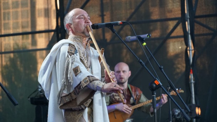 19.30 Музыканты удивили зрителей не только необычным стилем одежды, но и виртуозной игрой флейты, которая прекрасно гармонировала с родовыми барабанами и электрогитарой. В данном проекте участвуют этнические индейцы, которые в своих композициях обыгрывают древнеиндейские мотивы в современной обработке.