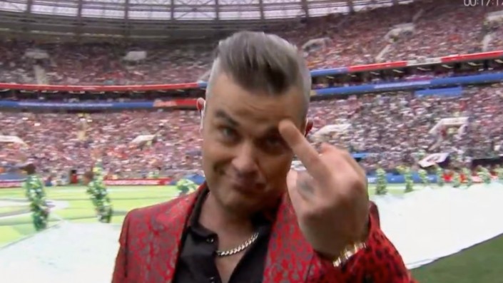Британский певец Робби Уильямс во время своего выступления на церемонии открытия чемпионата мира по футболу в Москве показал средний палец в камеру. Эпизод попал в телетрансляцию на российских федеральных каналах. Об этом сообщает "Чемпионат".