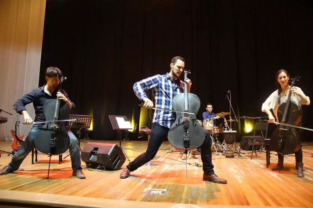 Примечательно, что инструменты музыкантов выполнены из очень плотного пластика - карбон. Раньше из этого материала изготавливались футляры для виолончелей и скрипок. Сегодня такие виолончели получили популярность среди музыкантов, работающих в жанре рока из-за более металлического звучания.