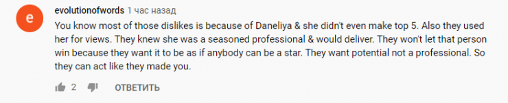 "...Данэлия даже не попала в пятерку лучших, они использовали ее для просмотра. Они знали, что она опытный профессионал и сделает все возможное. Они не позволят этому человеку победить, потому что хотят, чтобы все было так, как будто любой может стать звездой. Им нужен потенциал, а не профессионал".