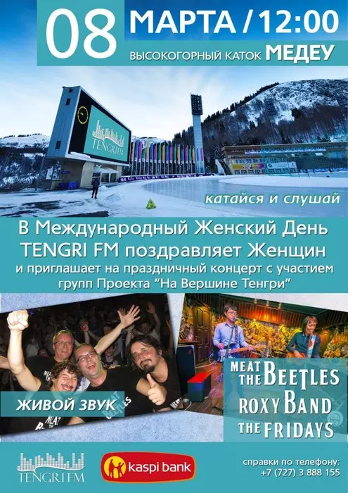 Радиостанция Tengri FM в честь Международного женского дня преподнесет алматинцам музыкальный подарок, передает Tengrinews.kz. 8 Марта в 11.00 на высокогорном катке "Медеу" выступит турецкая группа Meat The Beetles, исполняющая хиты легендарной ливерпульской четверки The Beatles. Также "зажигать" на площадке будут казахстанские группы Roxy Band и The Fridays. Пришедшие на "Медеу" смогут не только отдохнуть и покататься под живую музыку, но и увидеть выступление олимпийских чемпионов по фигурному катанию Натальи Бестемьяновой и Андрея Букина. Спортсменов мирового уровня на концерт пригласил Kaspi bank. Кроме того, по приглашению банка, в праздничном шоу примет участие также бронзовый призер Олимпиады в Сочи Денис Тен. У всех собравшихся будет возможность взять автограф у звезд. Кроме того, Kaspi bank подготовил много сюрпризов для зрителей. Стоимость билета на каток будет такой же, как и в обычные дни.