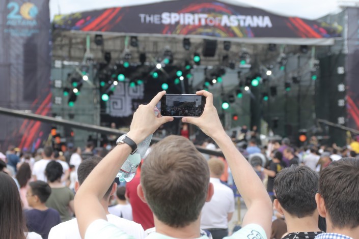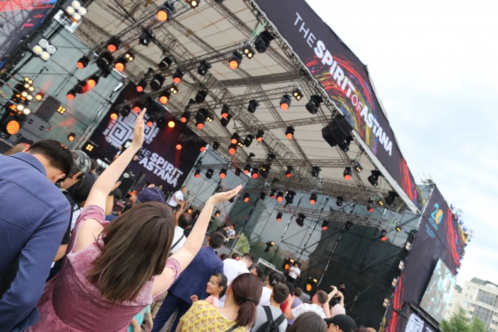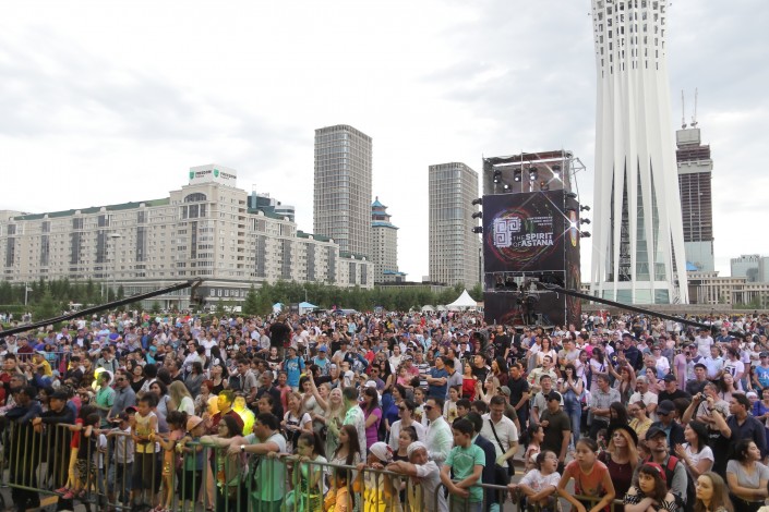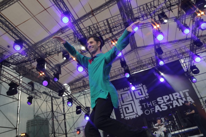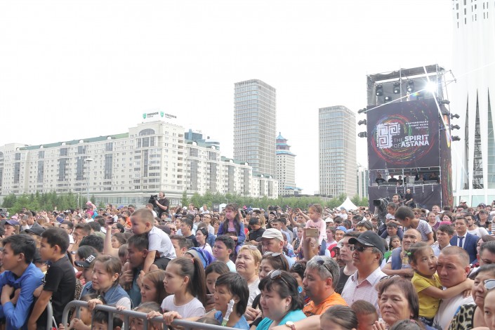 19.15 Фестиваль The Spirit of Astanа - поистине семейный праздник. Много пар и детей танцуют под этнические мотивы народов со всего мира. Под выступления артистов самые юные зрители зажигают на площадке и газоне у монумента "Байтерек".