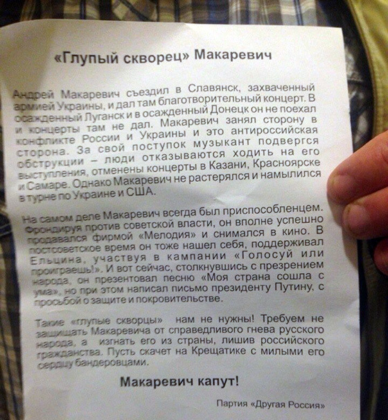 "После третьей песни музыкант обратился к зрителям с речью. И тут из первых рядов в него полетели помидоры и яйца. "Макаревич - предатель!", скандировали нацболы и разбрасывали листовки. В воздухе был распылен перцовый газ, после чего публика покинула зал. Концерт был сорван", - говорится в комментариях к видеозаписи. При этом авторы видео называют легендарного рок-музыканта "сторонником киевских карателей".