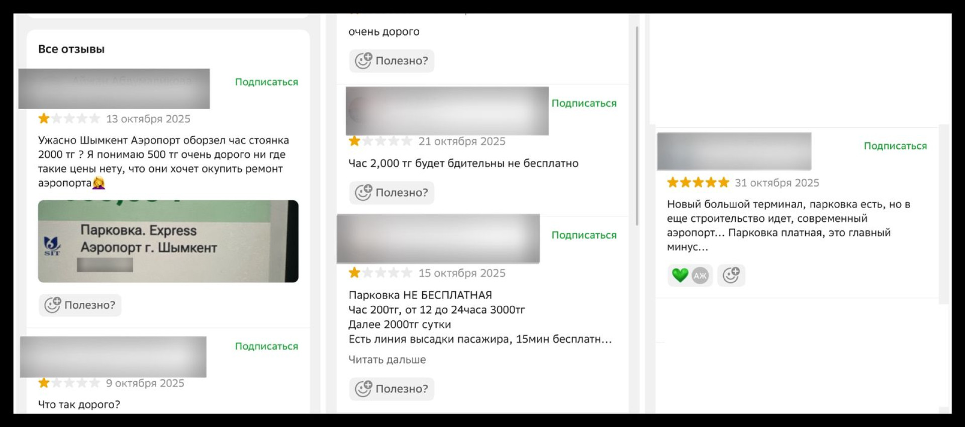 "Аэропорт Шымкента ужасно оборзел! Час стоянки стоит 2000 тенге! Я понимаю, что даже 500 тенге — это уже дорого, нигде нет таких цен. Неужели они хотят за счёт этого окупить ремонт аэропорта?", "Да, построен новый, большой и современный терминал, есть парковка, хотя строительство ещё продолжается... Но платная парковка — это главный минус!", "Почему так дорого?" — пишут пользователи.