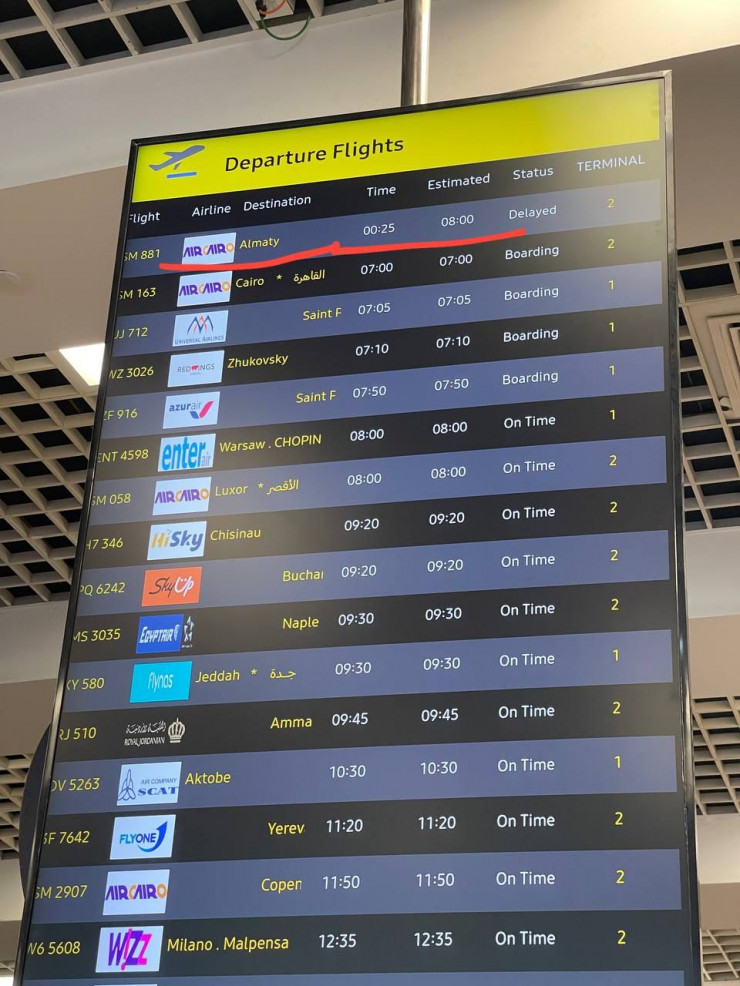 В редакцию Tengrinews.kz обратилась казахстанка, которая сообщила о задержке рейса из Шарм-эль-Шейха в Алматы. По ее словам, 177 человек уже более 8 часов не могут вылететь в Казахстан.