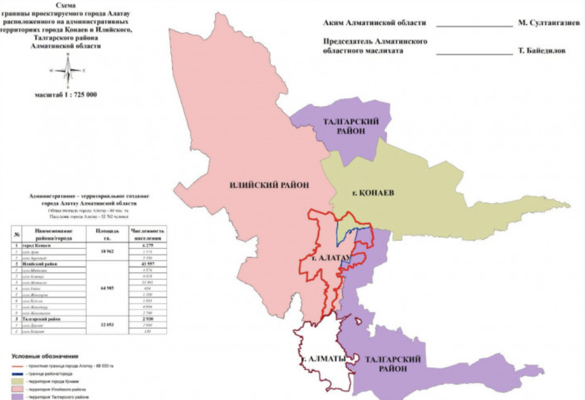 При этом изменили границы Илийского и Талгарского районов, а также города Конаева — часть территорий вошла в состав нового города. На карте это выглядит так: