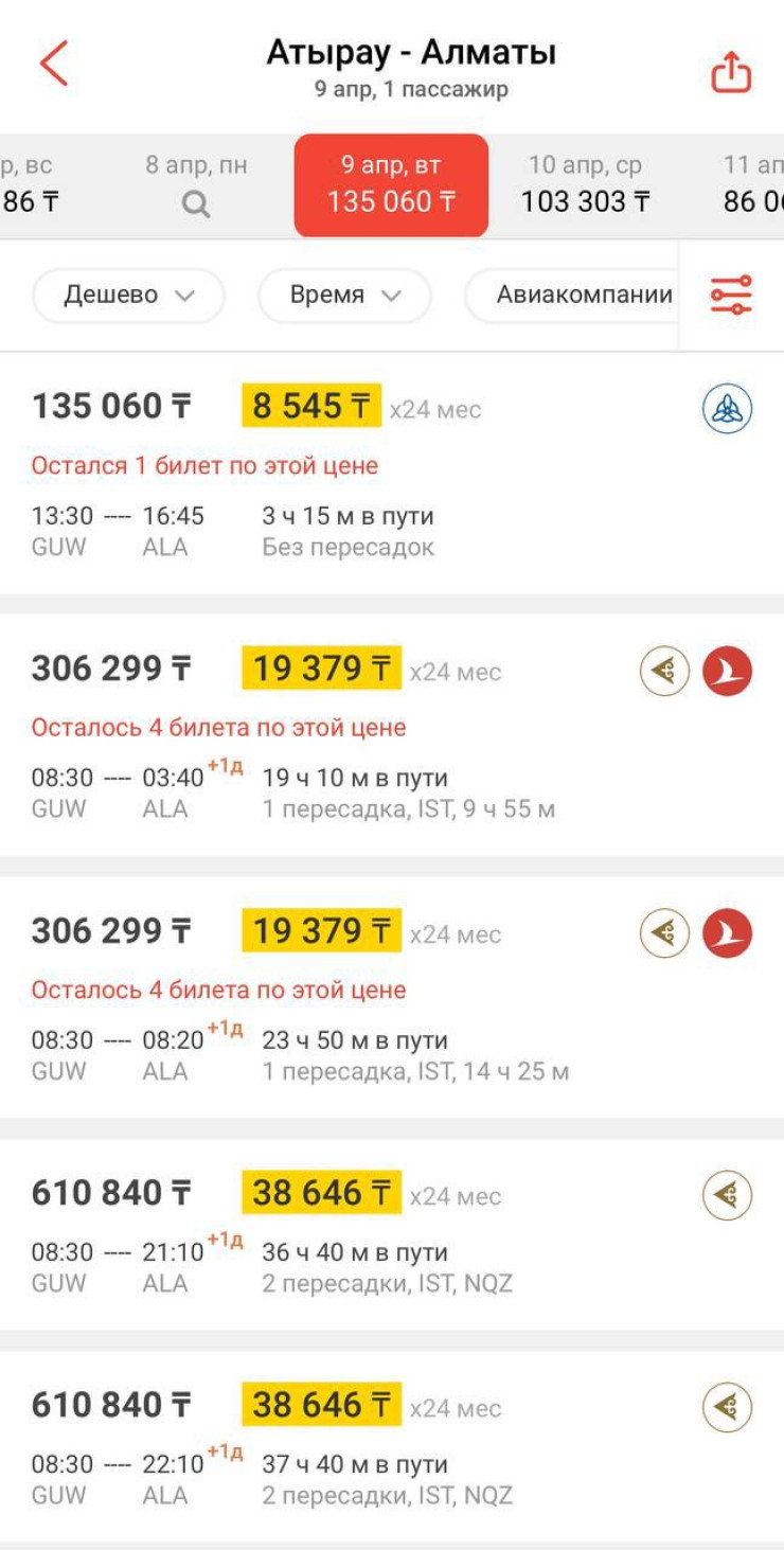 "На данных скринах опубликована стоимость авиабилетов из Атырау в Алматы, Астану или Актау, однако указаны рейсы с одной или двумя пересадками в Стамбуле, а также один из сегментов представлен билетами бизнес-класса. Таким образом, такие скрины вводят общественность в заблуждение. Для гарантии лучшей цены мы просим пассажиров выбирать прямые рейсы в экономклассе на официальном сайте авиакомпании или в приложении", - отметил авиаперевозчик.