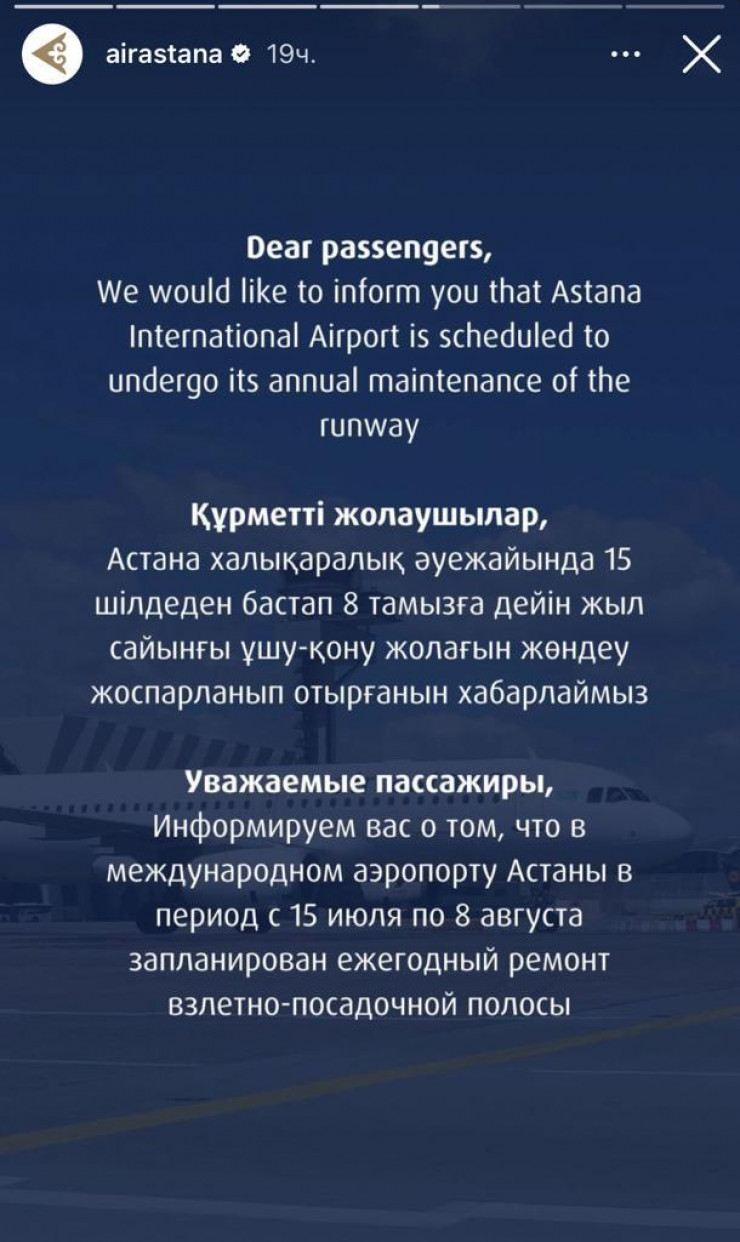 Авиакомпания Air Astana обратилась к пассажирам в связи с ежегодным ремонтом взлетно-посадочной полосы в аэропорту Астаны, передает Tengritravel.kz со ссылкой на сообщение компании.