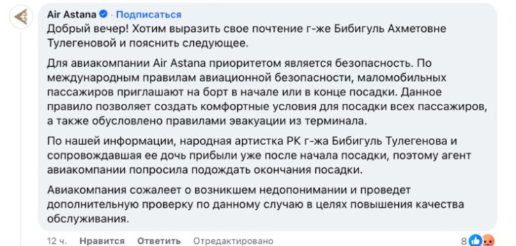 "Хотим выразить свое почтение госпоже Бибигуль Ахметовне Тулегеновой и пояснить следующее. Для авиакомпании Air Astana приоритетом является безопасность. По международным правилам авиационной безопасности маломобильных пассажиров приглашают на борт в начале или в конце посадки. Данное правило позволяет создать комфортные условия для посадки всех пассажиров, а также обусловлено правилами эвакуации из терминала. По нашей информации, народная артистка госпожа Бибигуль Тулегенова и сопровождавшая ее дочь прибыли уже после начала посадки, поэтому агент авиакомпании попросила подождать окончания посадки. Авиакомпания сожалеет о возникшем недопонимании и проведет дополнительную проверку по данному случаю в целях повышения качества обслуживания", – говорится в сообщении компании.