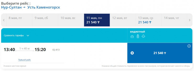Авиакомпания FlyArystan предлагает билеты на рейс Алматы - Павлодар с 12 мая. Стоимость билетов составит от 9 999 тенге, в зависимости от выбранной даты полета.