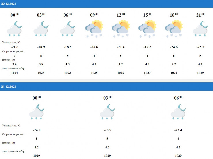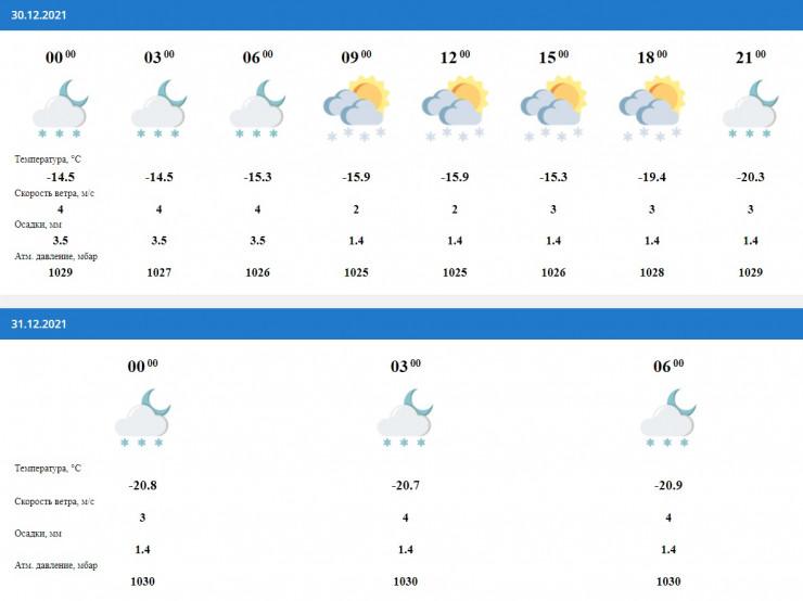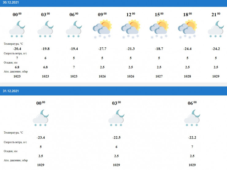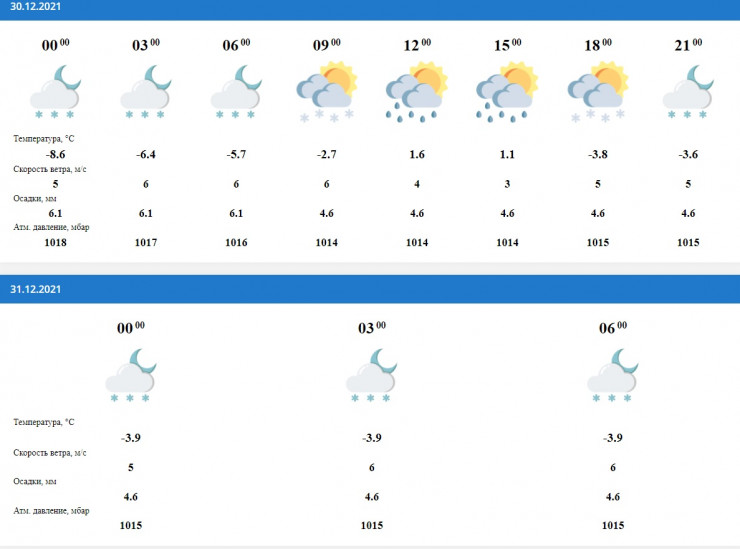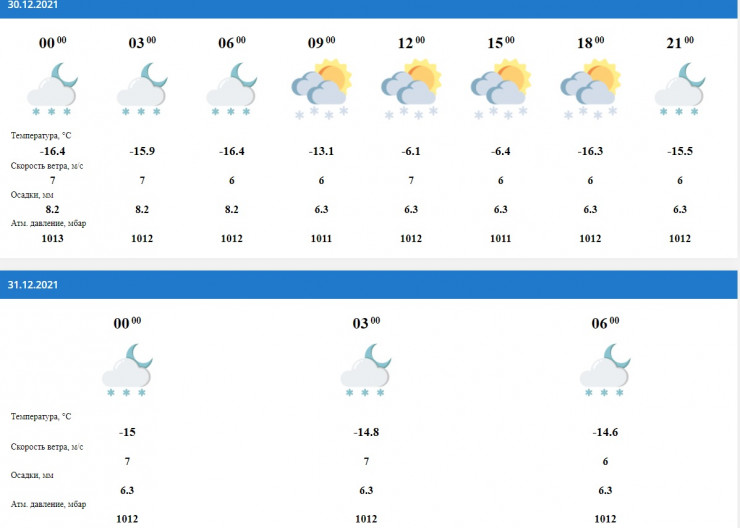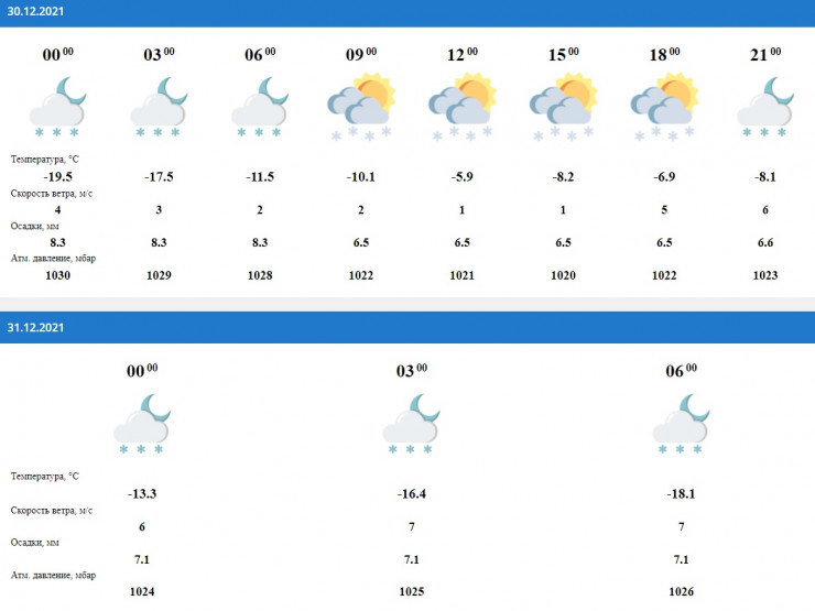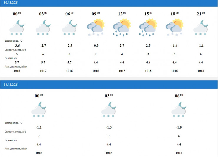 Такая же погода ожидается в Катоне. А вот в любимом месте отдыха президента Касым-Жомарта Токаева, Бухтарме, погода будет приятной - 8-10 градусов ниже нуля, ветер четыре метра в секунду и осадки в виде снега весь день 30 декабря.