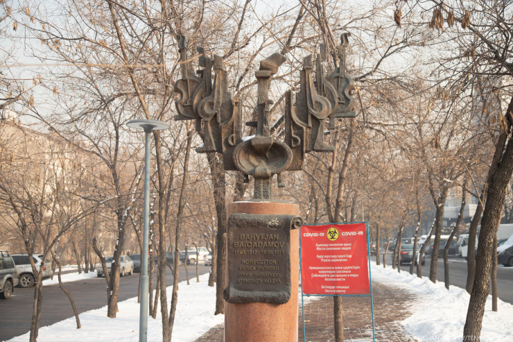 Первая остановка - это место, которое напомнит нам о необычной истории дружбы. На пересечении с улицей Байкадамова находится памятник Бахытжану Байкадамову, казахскому композитору. Он является автором музыкальной драмы "Майра" (1952), симфонических поэм "Светлая юность" (1952), "Колхозный праздник" (1953), сюит для хора: "На джайляу", "За мир" и других; вокальных композиций, крупных поэм для хора - "Мечта девушки", "Айтыс", "Плод труда".