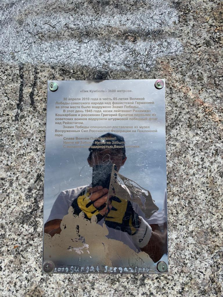 Есть и памятная табличка на Большом Алматинском пике. "2 февраля 1971 года сто спортсменов фирмы "Кызыл Ту" сделали восхождение на этот пик в честь 53-й годовщины Советской армии", - гласит надпись на табличке.
