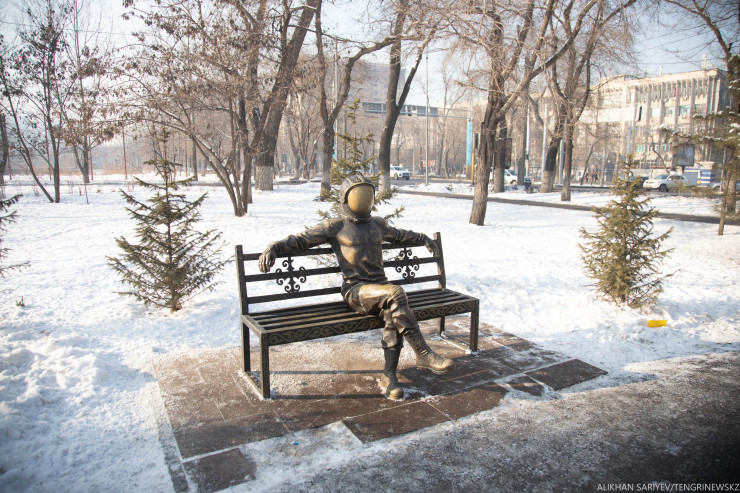 В этой части маршрута мы советуем вам все-таки прогуляться. Немного ниже, не доходя до проспекта Абая, на скамейке слева установлен памятник первому космонавту Юрию Гагарину. Композиция выполнена в шутливой форме и установлена в 2018 году. Авторами проекта являются студенты Казахской академии искусств имени Жургенова Азамат Кабыл и Акылбек Шакен.
