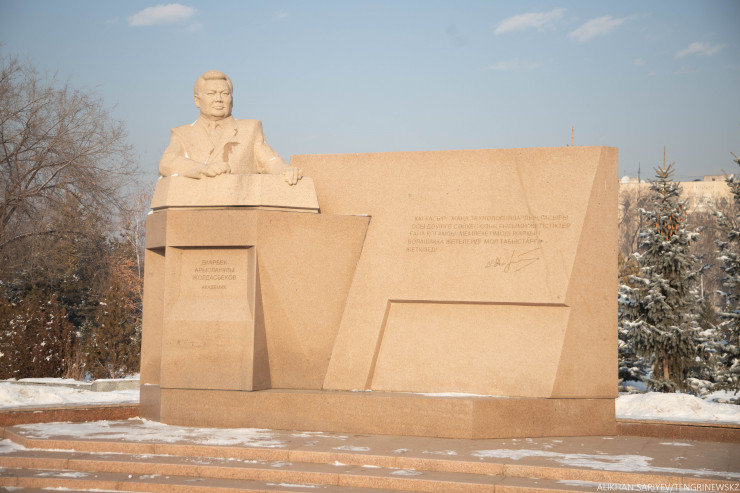 Насладившись посещением музея, отправляемся дальше. На пересечении улиц Сатпаева и Байтурсынова в сквере у Satbayev University в 1999 году был установлен памятник геологу, первому президенту Академии наук Казахстана Канышу Сатпаеву. Монумент поставили в честь 100-летнего юбилея. Скульптором является Тулеген Досмагамбетов.