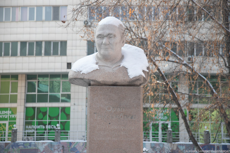А теперь нам надо перейти проспект Абая. Здесь во дворах между Манаса и Байзакова находится Алматинский колледж декоративно-прикладного искусства имени Орала Тансыкбаева. В 2012 году на его территории был установлен бюст Орала Тансыкбаева, автором является также Еркин Макулбаев. Орал Тансыкбаев - советский, казахский и узбекистанский художник казахского происхождения, который также является одним из основоположников узбекской живописи. Большую часть жизни провел в Узбекистане, оставил после себя сотни работ, выставлялся в Москве и США. После его смерти в доме, где он жил в Ташкенте, был открыт музей.