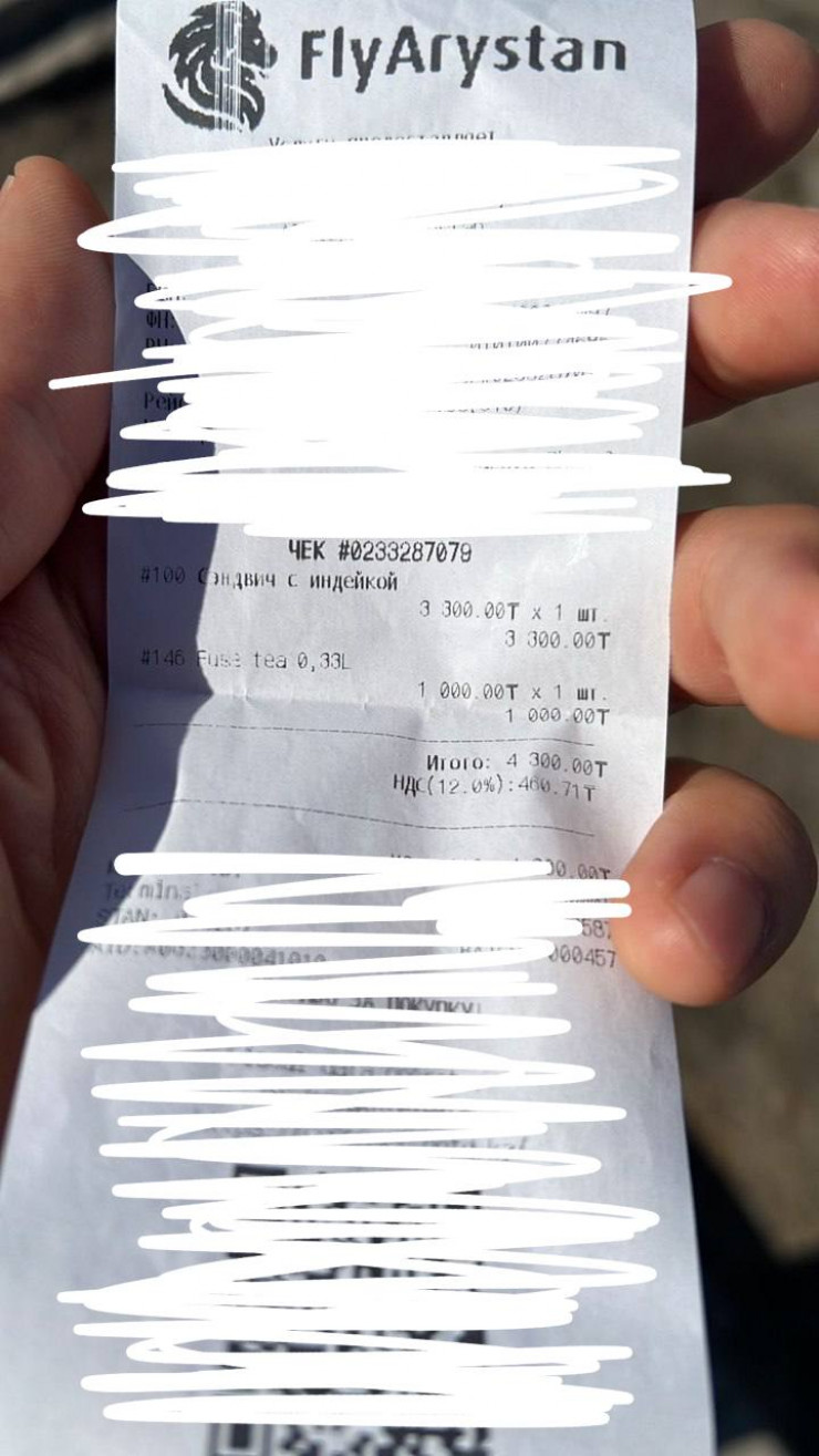 "Летел рейсом Астана - Кызылорда авиакомпании FlyArystan. Заметил, что еда заметно подорожала. Сэндвич в прошлом месяце стоил 2500 тенге, сейчас - 3300 тенге. Напиток раньше брал за 500 тенге, в этот раз купил уже за 1000 тенге", - удрученно отметил он.