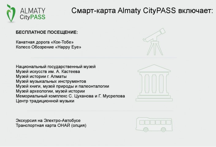 С помощью Almaty CityPASS туристы в течение трех дней смогут посетить достопримечательности, музеи и экскурсии южной столицы при этом сэкономить много времени и денег. На данный момент к карте уже подключено 12 туристических объектов Алматы. Туристы также смогут приобрести CityPASS с транспортной картой "ОНАЙ" для передвижения между объектами на общественном транспорте.