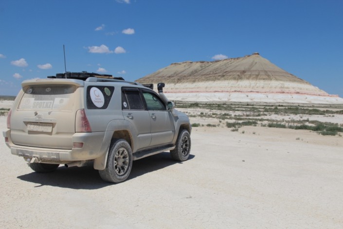 На следующий день, когда ветер стих и солнце осветило белоснежные горы, участники экспедиции повстречали одинокий внедорожник, также карабкавшийся по скалам. В таких, казалось бы, безлюдных местах, встретиться и не познакомиться - невозможно. Ведь оказавшись в дикой природе, испытываешь огромный интерес и чувство близости к таким же, как и ты, людям. В автомобиле оказалась туристка из Европы и ее гид - Сергей Хачатрян из Актау. В свободное от основной работы время он показывает достопримечательности Мангышлака иностранным туристам.