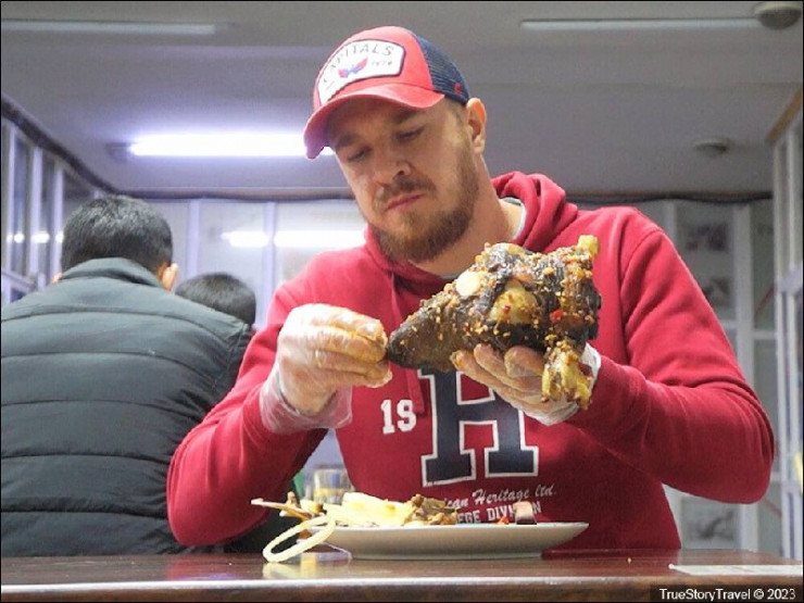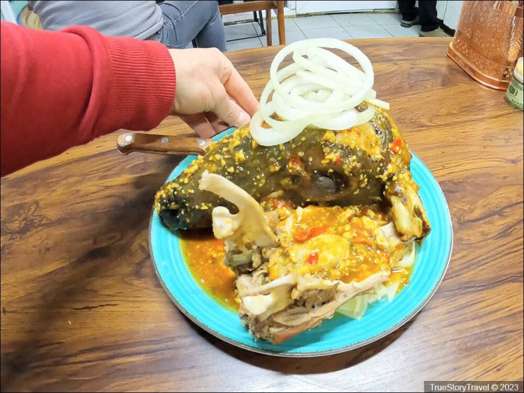 "Обедали в этой столовой только мужики. Как мне пояснили, для женщин это слишком "неопрятное" блюдо. Ведь выглядит оно весьма специфически, да и есть его надо руками. По большому счету, баранья голова состоит из двух принципиально разных частей: это мясо и кости. Под "мясом" подразумеваются все мягкие ткани - щечки, язык, уши, кожа, а также глаза и мозг. Ну а кости - это сама черепушка и нижняя челюсть. Их нужно полностью очистить от мягких тканей - тогда считается, что блюдо съедено полностью.