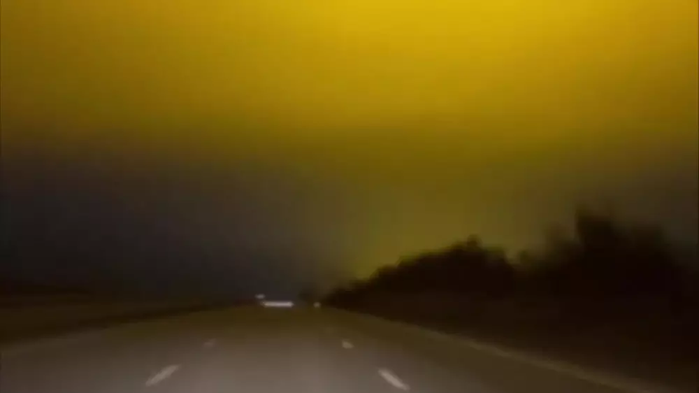 "Таңғы уақыт болатын. Осы бір ерекшелікті көлікте отырған барлығымыз бірдей байқадық. Өзіміз шығысқа қарай кетіп бара жатқанбыз, содан болар енді атып келіп жатқан күнді тұман жауып көз үйренген көк аспан қоңыр-сары түске боялды. Мұндай құбылыс күнде болмасы анық. Бұл әп-сәттік құбылыс емес, біраз уақыт осылай тұрды. "Поляр шұғыласы" деген құбылыс бар ғой, соған ұқсаттым. Әдемі көрініс. Таңданысымызда шек жоқ, дереу телефонға түсірдім", - дейді журналист.