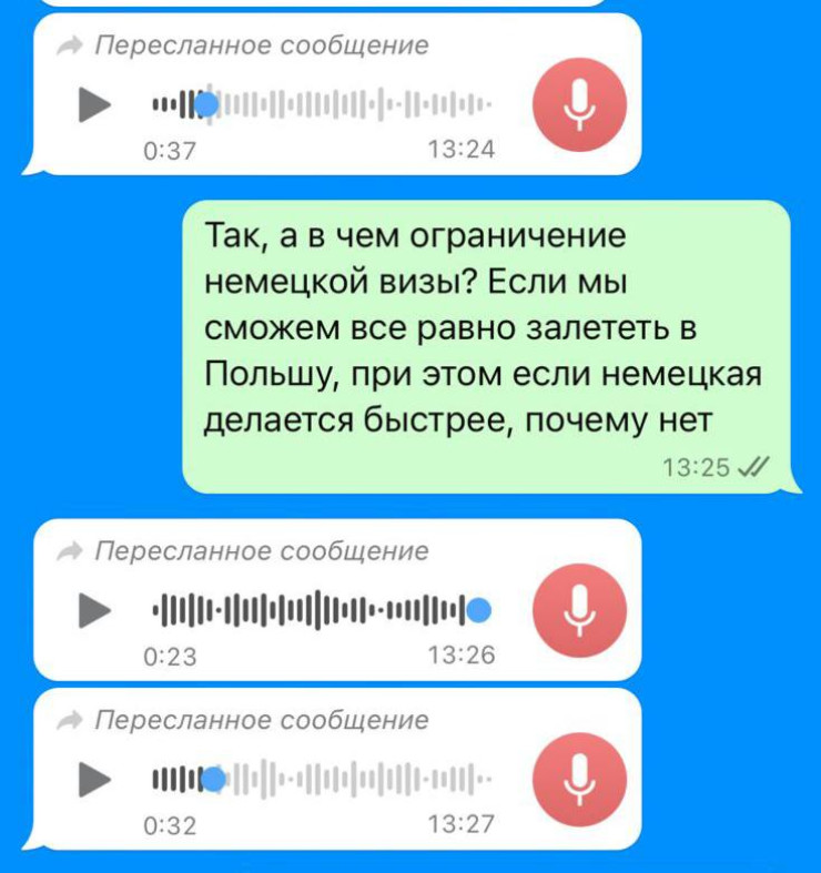 "Причин для поездки в Германию не было. Нам нужна была только Польша, о чем визовая компания прекрасно знала. Уже потом выяснилось, что они говорили про документы, которые я должен был бы показать при регистрации на рейс, о том, что планирую также посетить Германию. Но в тот промежуток времени я думал, что это дополнительные документы, это то, что они хотят предоставить при подаче на визу в консульство, поэтому не стал уточнять вопрос.