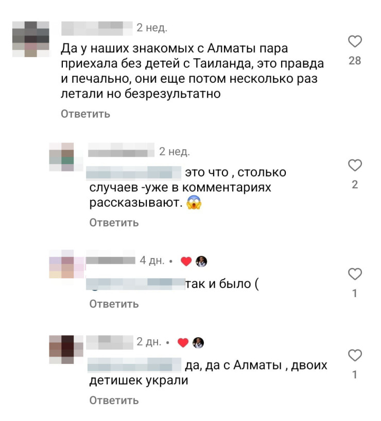 "Да, у наших знакомых из Алматы пара приехала без детей из Таиланда. Это правда, и печально, они еще потом несколько раз летали, но безрезультатно", - написала одна из пользователей.
