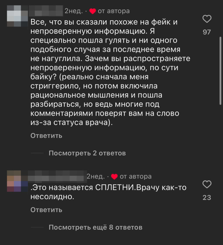 "Все, что вы сказали, похоже на фейк и непроверенную информацию. Я специально пошла гуглить и ни одного подобного случая за последнее время не нагуглила. Зачем вы распространяете непроверенную информацию, по сути байку?" - написали комментаторы.