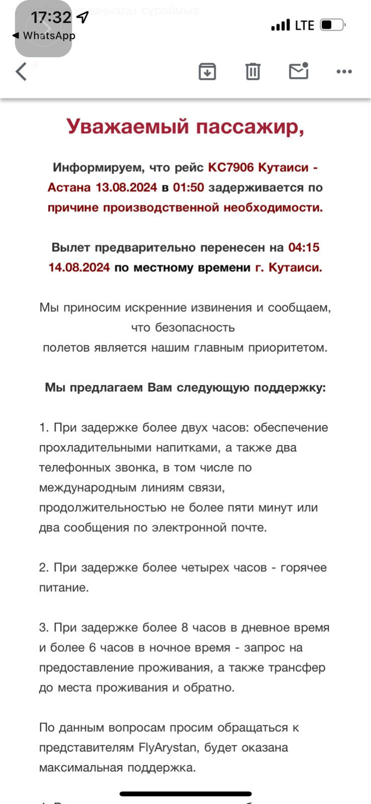 Авиакомпания FlyArystan направила пассажирам сообщение, в котором извиняется за причиненные неудобства и сообщает о переносе рейса. В письме также указывается, что безопасность полетов является главным приоритетом компании, и в качестве поддержки пассажирам предложены прохладительные напитки, горячее питание и при необходимости проживание с трансфером.