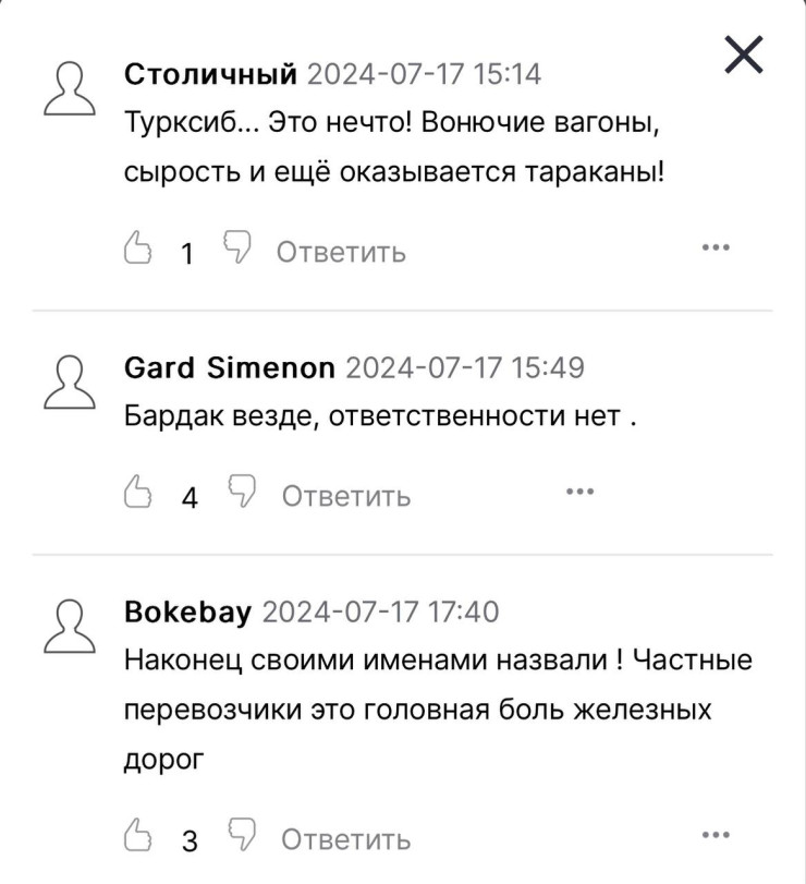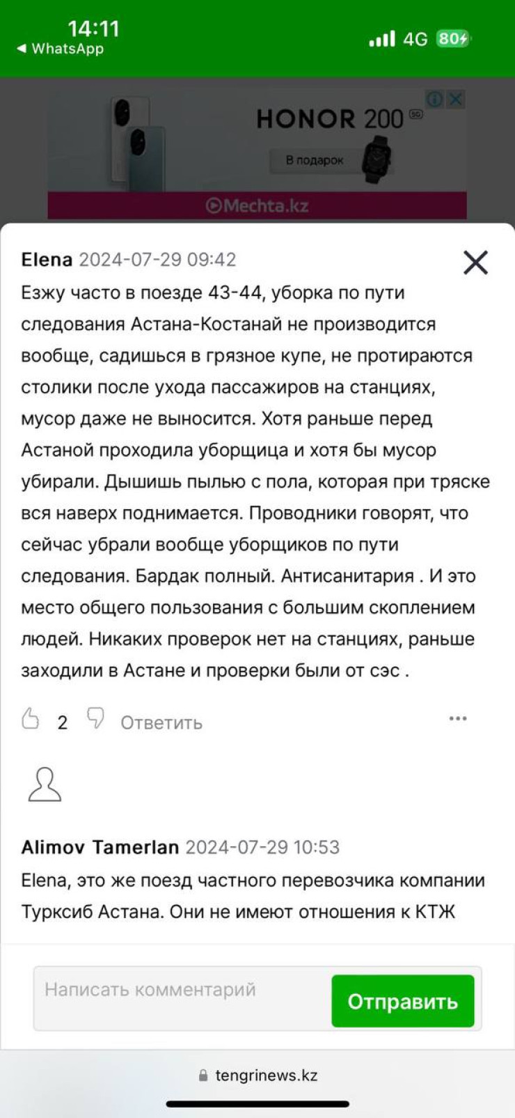 К слову, обвинения посыпались и в сторону "Пассажирские перевозки". Они также прокомментировали ситуацию, подчеркнув, что поезд №43 сообщением Костанай – Алматы принадлежит частному перевозчику и не относится к ведению "КТЖ" и их компании.