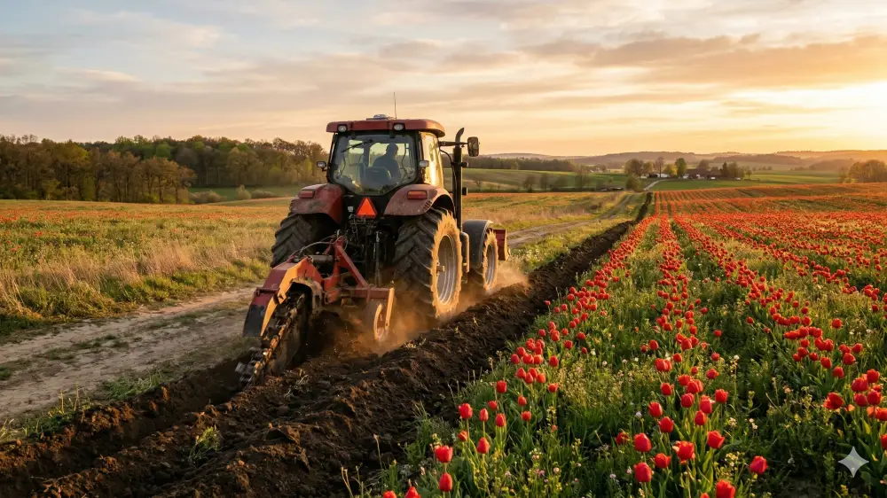 На опубликованных в сети кадрах видно, как трактор движется по полю рядом с участком, где фотографируются люди среди цветущих тюльпанов Грейга.