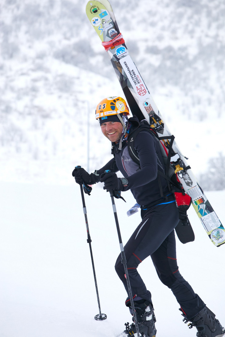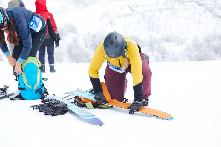 Лыжи необычные, легкие и компактные. Ботинки позволяют делать пешие переходы, выстегиваться и шагать как на беговых лыжах, а также нестись вниз по склону. Собственно, из этих этапов и складывается гонка. Чтобы идти вверх, на лыжи крепят камус – ленту с направленным ворсом, которая не дает соскальзывать вниз. Изобретение не новое. Камусы использовали охотники много сотен лет назад. Принцип действия остался такой же.