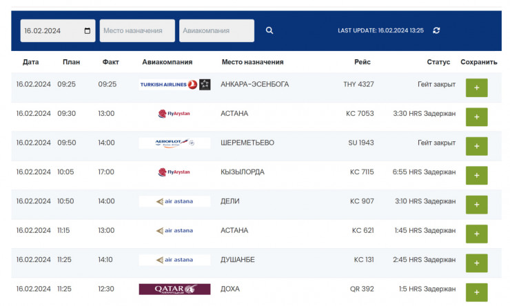 По данным, указанным на онлайн-табло, на момент публикации задерживаются на вылет 13 рейсов в Астану, Кызылорду, Дели, Душанбе, Доху, Усть-Каменогорск.