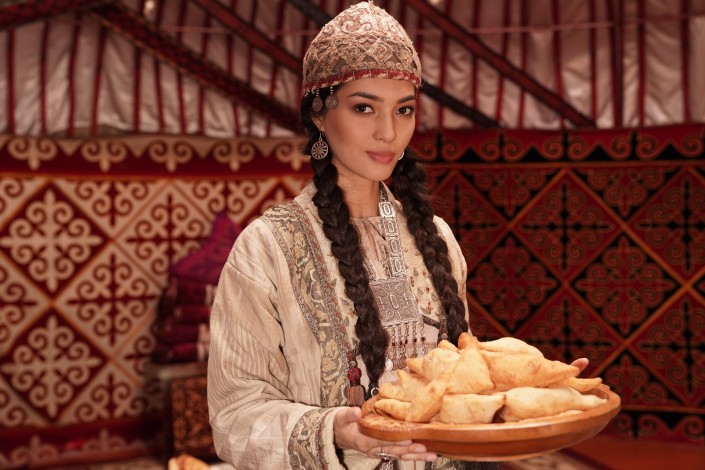 Наконец мы приехали на самые "аппетитные" съемки. Рассказ пойдет о казахской национальной кухне. "Мисс Казахстан" Мадина Батык заходит в юрту, где накрыт богатый дастархан с шубатом, казы и бешбармаком.