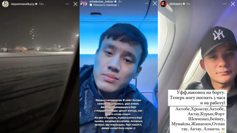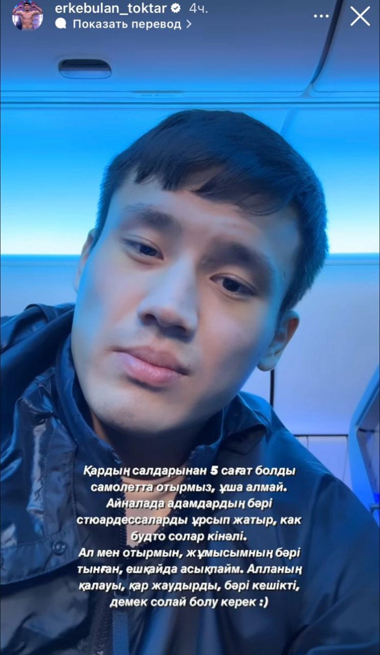 Между тем казахстанский актер и боец смешанных единоборств (ММА) Еркебулан Токтар сообщил, что его рейс задержали более чем на 5 часов. Актер рассказал, что несколько часов просидел в самолете из-за загруженности аэропорта.